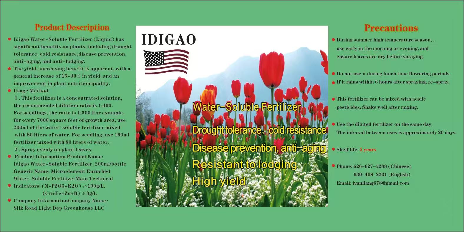 Idigao Water-Soluble Fertilizer (Liquid) has significant benefits on plants, including drought tolerance, cold resistance, disease prevention, anti-aging, and anti-lodging.